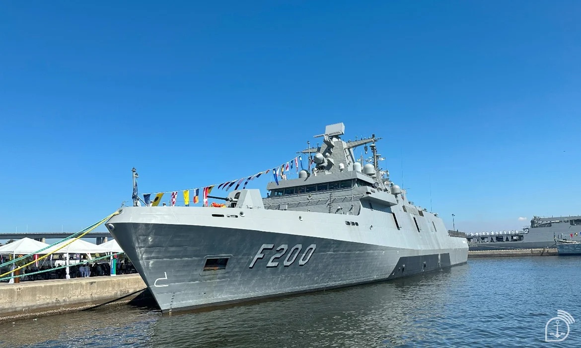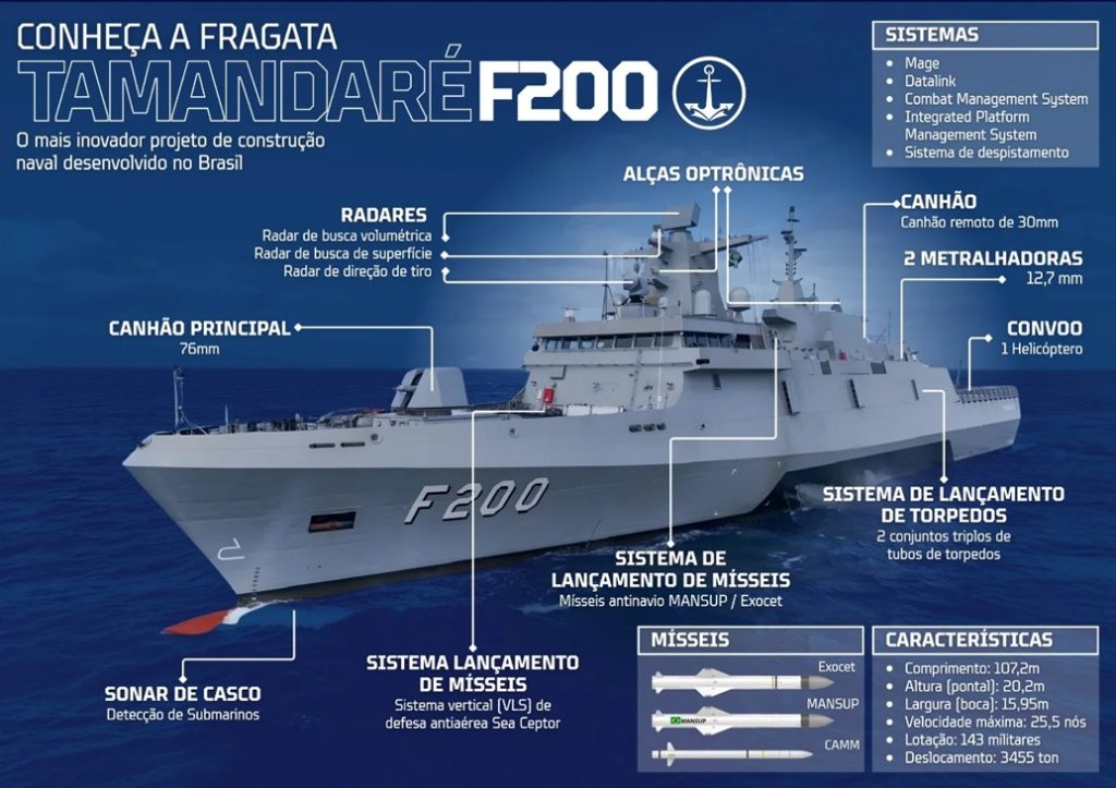 Primeira Fragata de um lote de quatro navios do Programa Fragatas Classe Tamandaré (PFCT), a F200 é resultado da parceria entre a MB e a Sociedade de Propósito Específico Águas Azuis, formada pela TKMS, Embraer Defesa e Segurança e Atech, sob gestão da Empresa Gerencial de Projetos Navais (EMGEPRON).