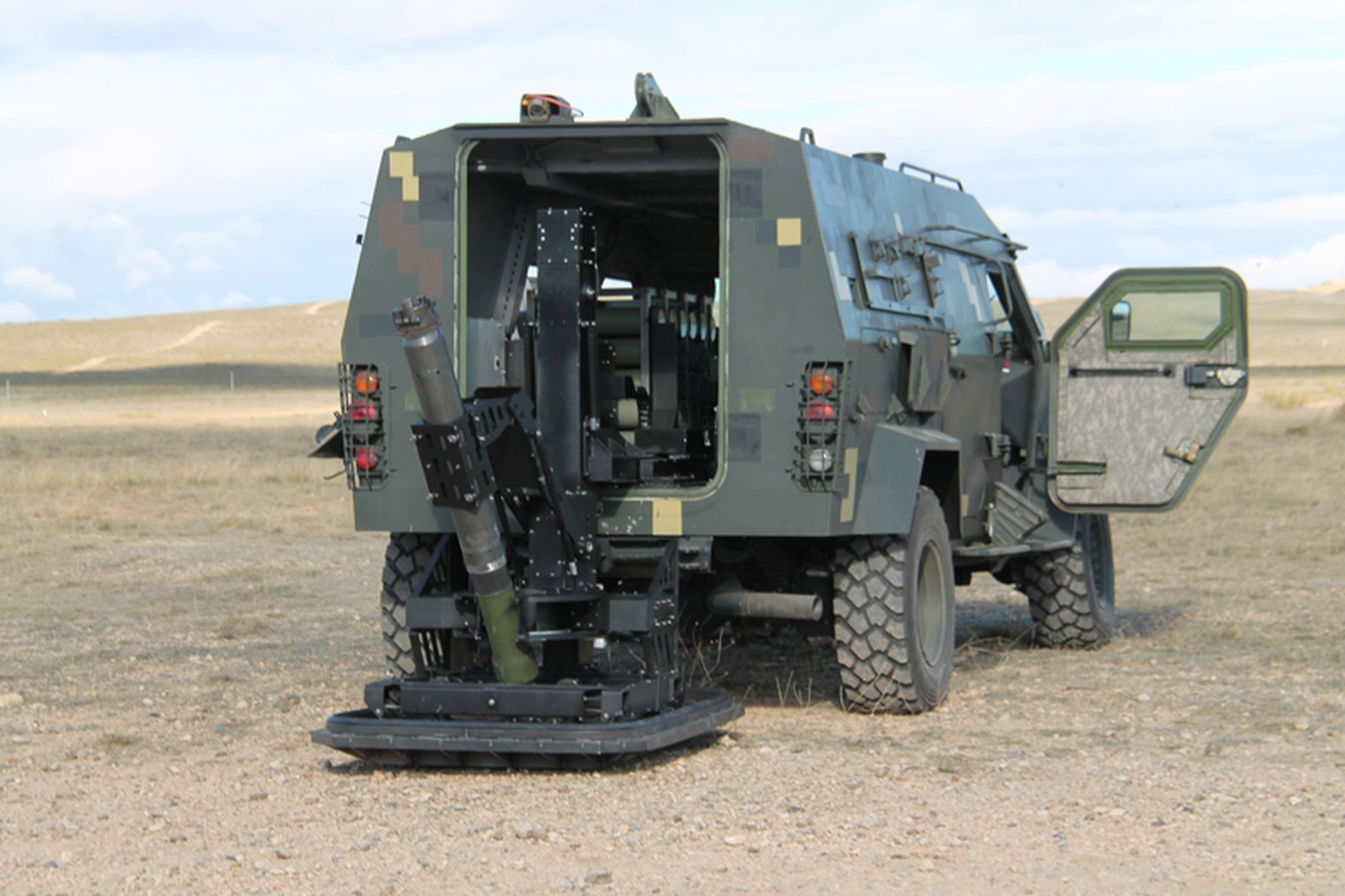 Trata-se de um sistema realmente inovador, que é montado em um módulo onde toda a peça é colocada fora do veículo e utilizando o solo para absorver toda a energia do recuo, como um morteiro tradicional. Esse método permite que todo o sistema de 120mm pese em torno de 300 kg, o que permite que ele seja instalado em veículos muito leves, como foi nas Land Rover 110, Jeep J8 e Agrale Marruá AM-21, utilizados pela empresa para demonstrar seu produto.