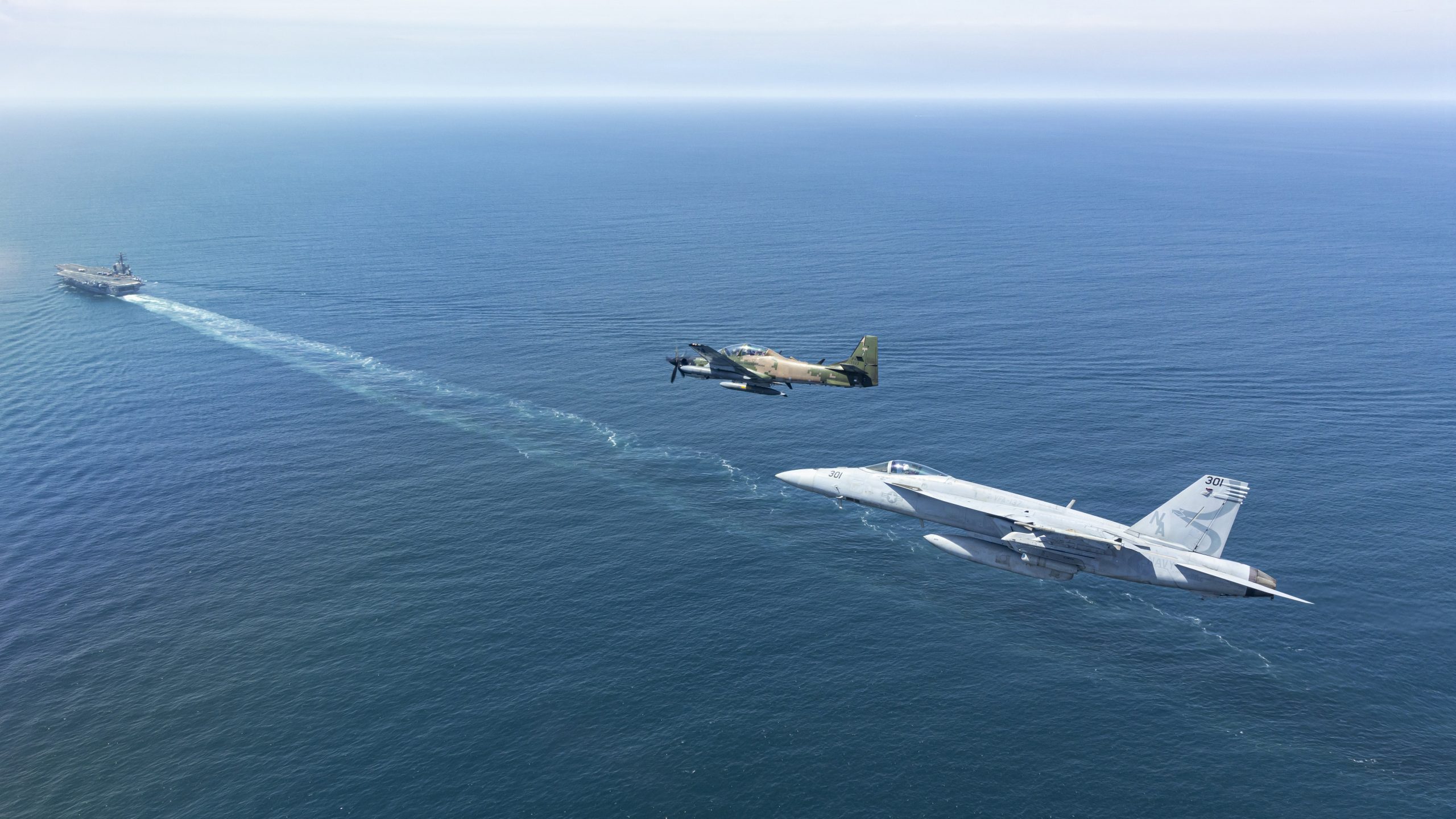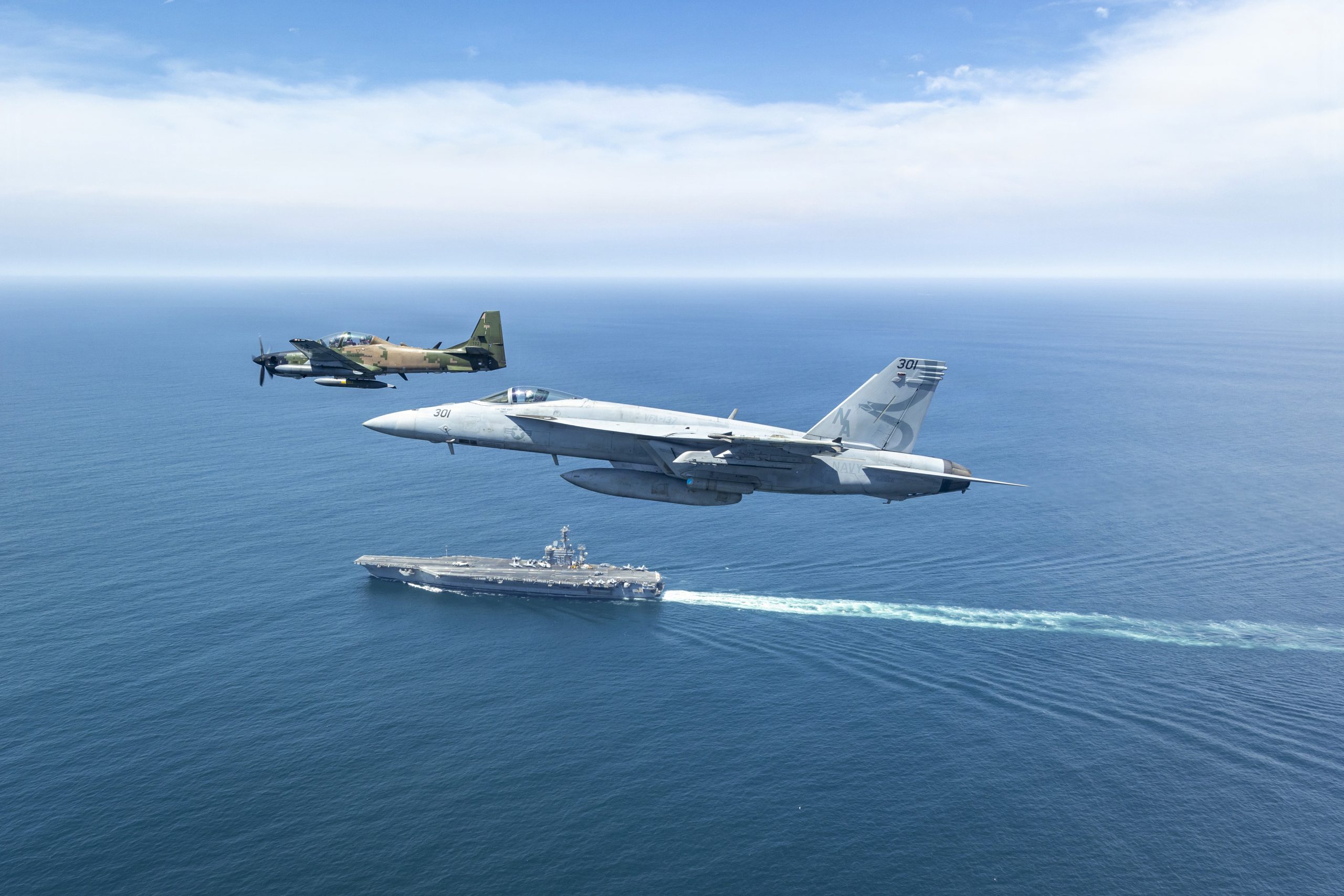 A Marinha dos Estados Unidos divulgou na quinta-feira (09) imagens de um treinamento conjunto com a Força Aérea do Equador, realizado no Oceano Pacífico. A atividade chamou atenção pelo encontro incomum entre um A-29B Super Tucano e um F/A-18E Super Hornet, que voaram em formação sobre o porta-aviões nuclear USS Nimitz (CVN-68) durante sua passagem pela América do Sul.